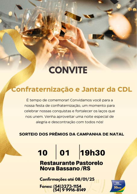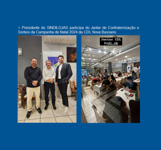 > Na noite de sexta-feira (10/01), o Presidente do SINDILOJAS, Nelson Vazatta, participou do Jantar de Confraternização e sorteio da Campanha de Natal 2024 “DUPLA CHANCE DE GANHAR” realizado pela CDL Nova Bassano - Câmara De Dirigentes Lojistas De Nova Bassano.