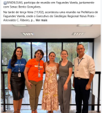 > O Executivo do Sindilojas Regional Nova Prata - Ariovaldo C. Ribeiro, participou de uma reunião na Prefeitura de Fagundes Varela, com a Coordenadora Geral do Governo, Marina Taglian, a Secretária de Gestão, Finanças e Desenvolvimento Econômico, Deisi Zat, juntamente com a Lisângela Antonini, Diretora do Senac Bento Gonçalves e Quelem Maciel, Soluções Corporativas do Senac Bento Gonçalves.