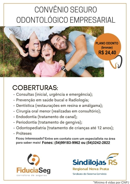 > Pelo valor de R$ 24,40 no Plano Odonto BRONZE - você pode usar o Convênio "Seguro Odontológico Empresarial”, pelo SINDILOJAS.