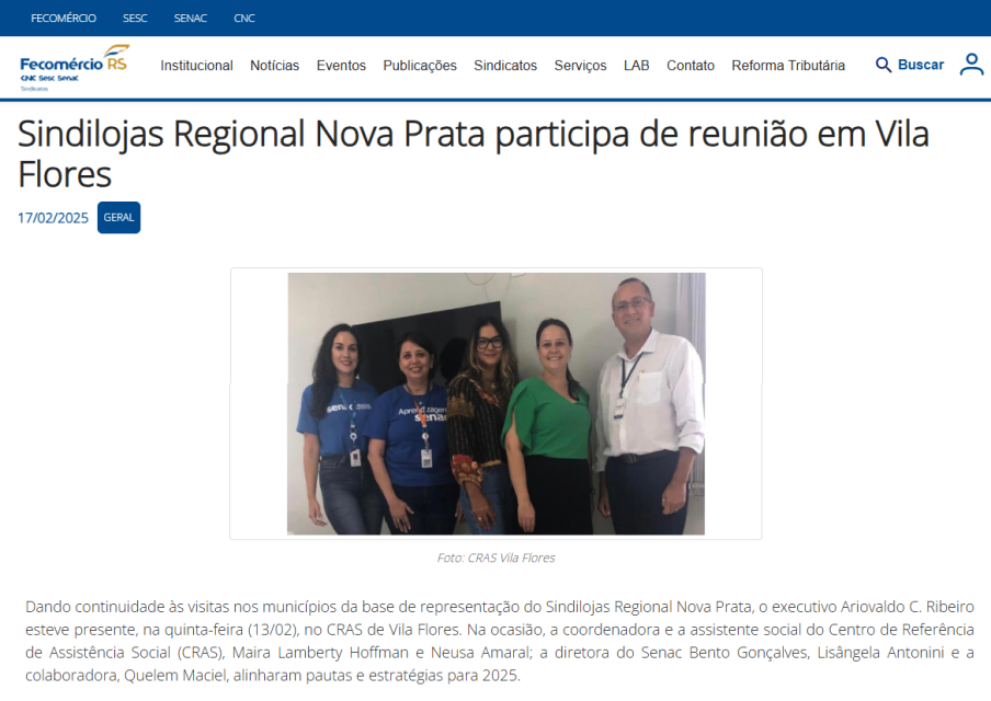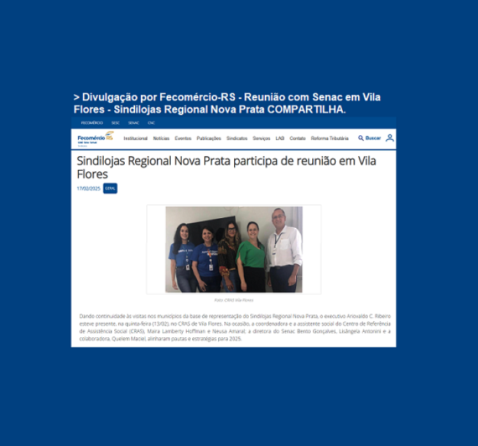 26/02 - Divulgação por Fecomércio-RS - Reunião com Senac em Vila Flores - Sindilojas Regional Nova Prata COMPARTILHA.
