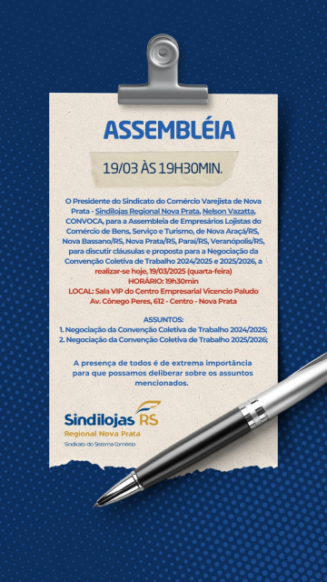 Assembleia de Empresários Lojistas do Comércio de Bens, Serviço e Turismo, de Nova Araçá/RS, Nova Bassano/RS, Nova Prata/RS, Paraí/RS, Veranópolis/RS, para discutir cláusulas e proposta para a Negociação da Convenção Coletiva de Trabalho 2024/2025 e 2025/2026, a realizar conforme abaixo: