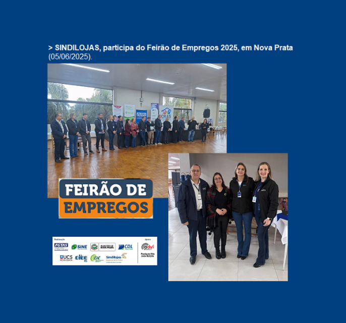 > A edição de 2025 do Feirão de Empregos, aconteceu na quinta-feira (05/06), no Salão Paroquial de Nova Prata. O Sindilojas Regional Nova Prata, novamente participou em um espaço, juntamente com CDL, CIC e UCS. O Presidente Nelson Vazatta e o Executivo Ariovaldo C. Ribeiro, participaram da Abertura Oficial. Estiveram presentes autoridades e representantes de entidades.