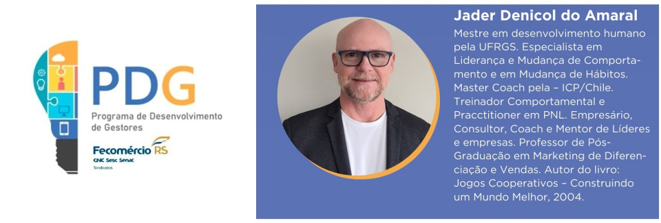 Jader, é mestre em desenvolvimento humano pela UFRGS. Especialista em Liderança e Mudança de Comportamento e em Mudança de Hábitos. Master Coach pela – ICP/Chile. Treinador Comportamental e Pracctitioner em PNL. Empresário Consultor, Coach e Mentor de Líderes e empresas. Professor de Pós-Graduação em Vendas. Autor do livro: Jogos Cooperativos – Construindo um Mundo Melhor, 2024.