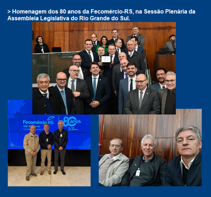 Na parte da tarde, aconteceu a Homenagem dos 80 anos da Fecomércio-RS, na Sessão Plenária da Assembleia Legislativa do Rio Grande do Sul. Deputado Estadual Guilherme Pasin prestou a homenagem no Plenário 20 de Setembro.