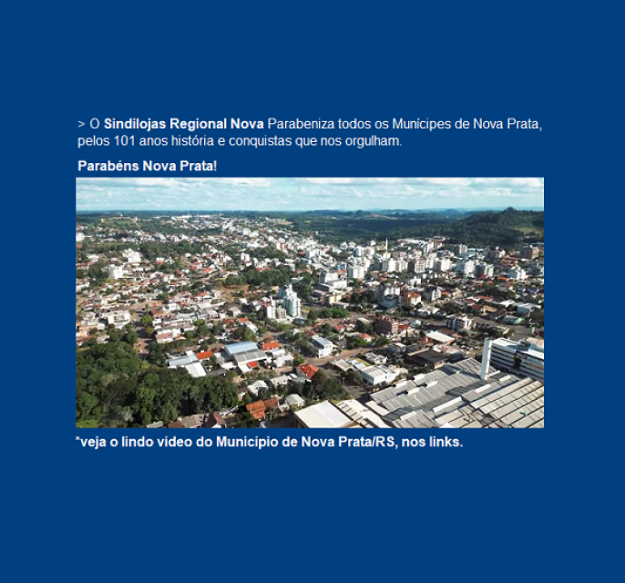 > O Sindilojas Regional Nova Parabeniza todos os Munícipes de Nova Prata, pelos 101 anos história e conquistas que nos orgulham.