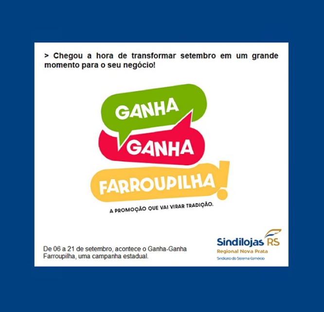 De 6 a 21 de setembro, acontece o Ganha-Ganha Farroupilha, uma campanha estadual criada pelo Governo do Estado, com correalização de várias entidades e o Sindilojas Regional Nova Prata, está junto para ajudar movimentar o mês de “setembro” em todo o estado.