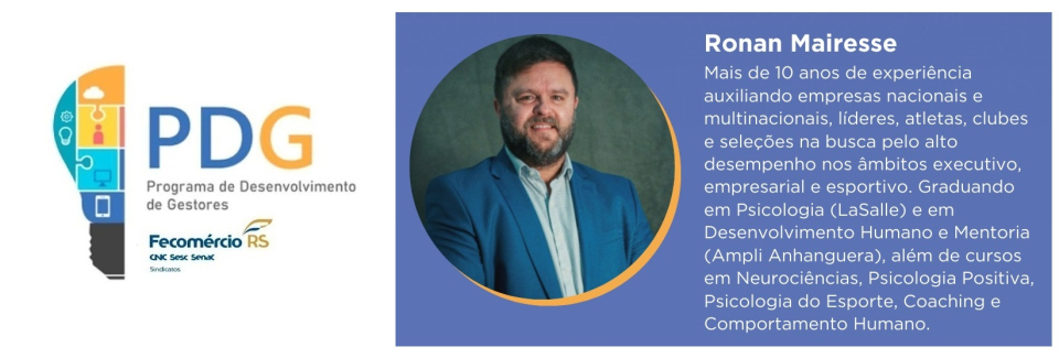 Ronan, mais de 10 anos de experiência auxiliando empresas nacionais e multinacionais, líderes, atletas, clubes e seleções na busca pelo alto desempenho nos âmbitos executivo, empresarial e esportivo. Graduado em Psicologia (LaSalle) e em Desenvolvimento Humano e Mentoria (Ampli Anhanguera), além de cursos em Neurociências, Psicologia Positiva, Psicologia do Esporte, Coaching e Comportamento Humano.
