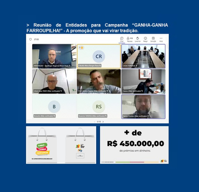 > Terça-feira (02/09), aconteceu mais uma reunião on-line, com informações da Campanha “GANHA-GANHA FARROUPILHA”. O Executivo do Sindilojas Regional Nova Prata, participou, onde foram apresentadas várias ações que estão sendo realizada em todo o estado para divulgar a campanha.