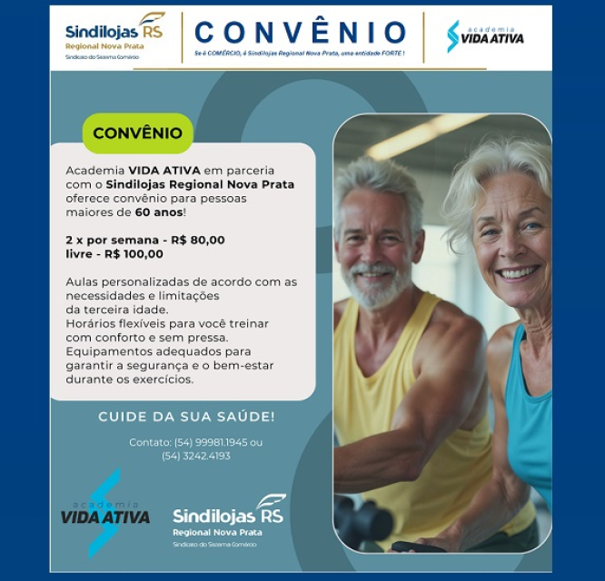 CONVÊNIO: Academia VIDA ATIVA, oferece no convênio para empresários e colaboradores Associados ao SINDILOJAS, um desconto especial para pessoas maiores de 60 anos (2 x por semana - R$ 80,00 e livre - R$ 100,00).