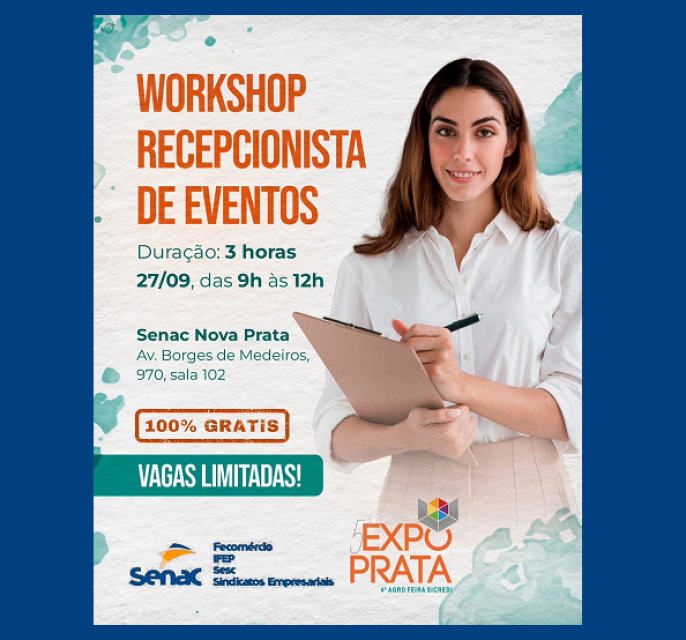 > O Senac Nova Prata, em parceria com a 5ª EXPO PRATA, realizará o “Workshop Recepcionista de Eventos”, com duração 3h.