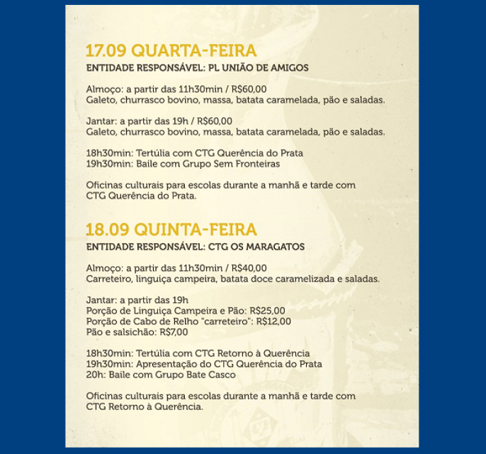 Não fique de fora! Traga sua família, chame os amigos e venha celebrar a tradição gaúcha com muita alegria, música e sabores típicos. A Semana Farroupilha espera por você!
