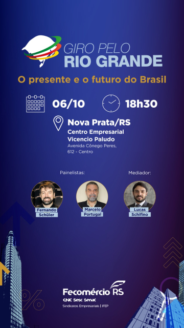 No dia 06 de outubro, às 18h30, a Fecomércio-RS realiza mais uma edição e conta com o apoio do Sindilojas Regional Nova Prata, para evento que promove reflexões sobre o presente e o futuro do Brasil, analisando os cenários político e econômico que impactam o país e o Rio Grande do Sul.