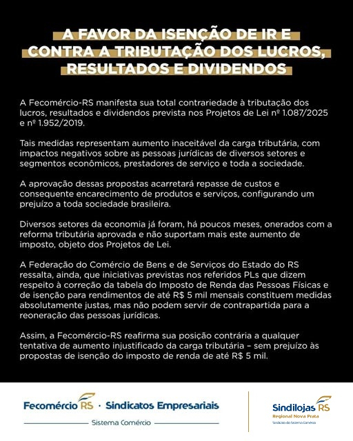 A Fecomércio-RS manifesta sua total contrariedade à tributação dos lucros, resultados e dividendos prevista nos Projetos de Lei Nº 1.087/2025 e Nº 1.952/2019.