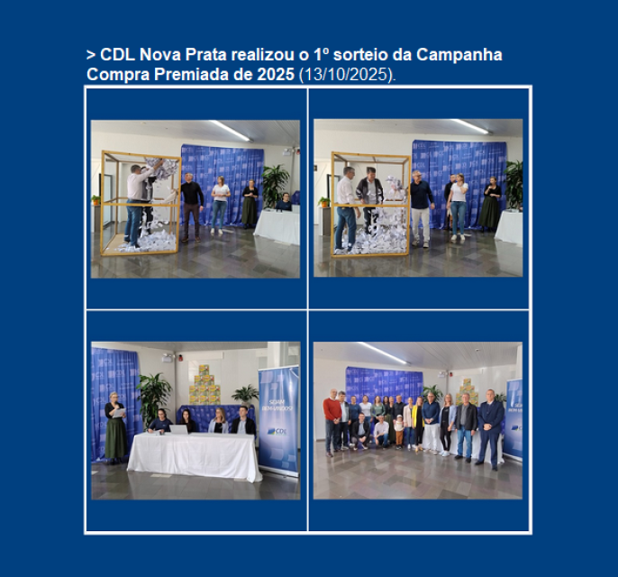 > A CDL Nova Prata realizou, na tarde desta segunda-feira (13/10), o 1º sorteio da campanha "Compra Premiada", evento que marcou também a comemoração dos 53 anos da entidade. A ação tem como objetivo incentivar as compras no comércio local e valorizar os consumidores da região.