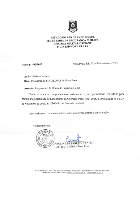 > Na manhã de 27/11 (quinta-feira), aconteceu na Praça da Bandeira de Nova Prata, o “Lançamento da Operação Papai Noel 2025” - Brigada Militar de Nova Prata. O Sindilojas Regional Nova Prata, convidado, se fez presente com o Diretor de Finanças e Patrimônio Pascoal Azambuja Bavaresco.