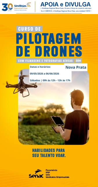 Curso: PILOTAGEM DE DRONES COM FILMAGENS E FOTOGRAFIAS AÉREAS – Senac Nova Prata / SINDILOJAS – APOIA e DIVULGA: