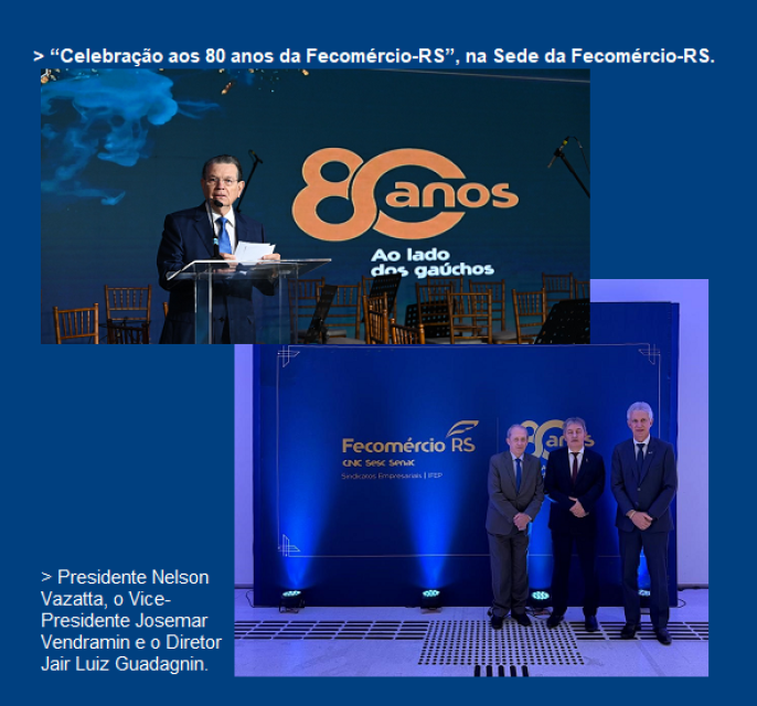 > No dia 05/08 (terça-feira), os Diretores da Fecomércio-RS, pelo Sindilojas Regional Nova Prata, sendo eles: o Presidente Nelson Vazatta, o Vice-Presidente Josemar Vendramin e o Diretor Jair Luiz Guadagnin, participaram em Porto Alegre, dos eventos em Comemoração aos 80 anos da Fecomércio-RS.