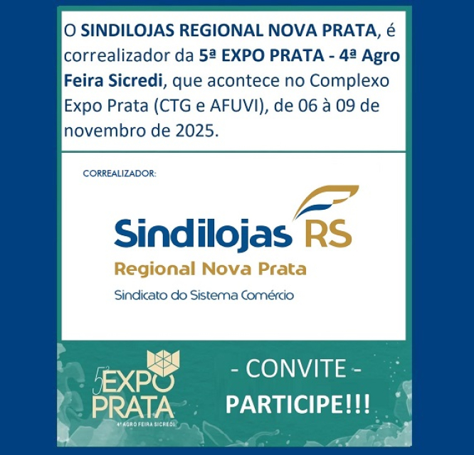 O SINDILOJAS REGIONAL NOVA PRATA, é correalizador da 5ª EXPO PRATA - 4ª Agro Feira Sicredi, que acontece no Complexo Expo Prata (CTG e AFUVI), de 06 a 09 de novembro de 2025.