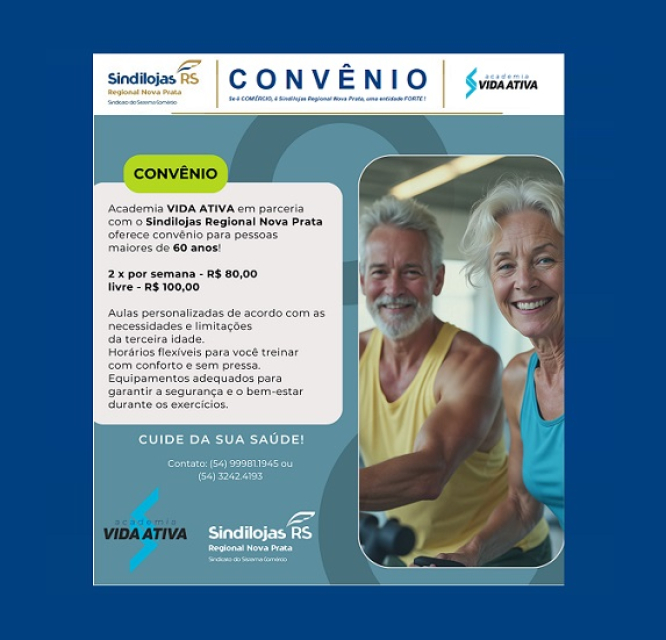 CONVÊNIO: Academia VIDA ATIVA, oferece no convênio para empresários e colaboradores Associados ao SINDILOJAS, um desconto especial para pessoas maiores de 60 anos (2 x por semana - R$ 80,00 e livre - R$ 100,00).