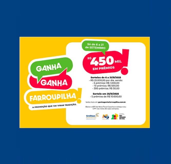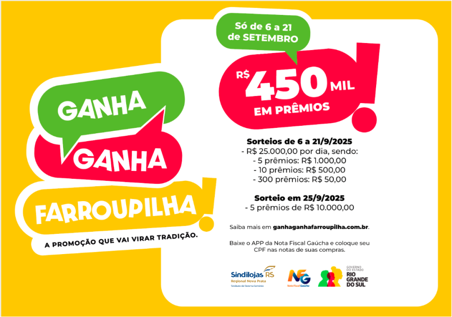 > A campanha “GANHA-GANHA FARROUPILHA!” - A promoção que vai virar tradição, iniciou no dia 06 e vai até o dia 21 de setembro de 2025. É uma iniciativa do Governo do Estado do Rio Grande do Sul, em parceria com várias entidades como Fecomércio-RS, CDL POA, FAMURS, AGAS, FEDERASUL entre outras, assim como o Sindilojas Regional Nova Prata.