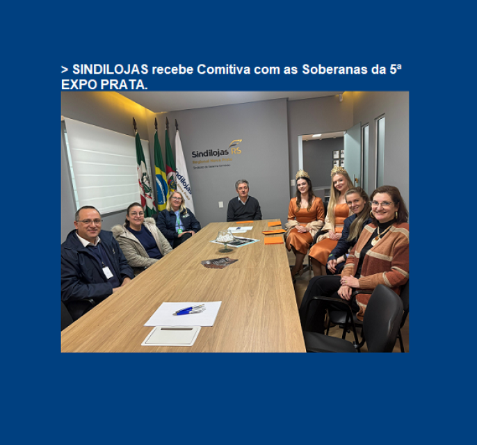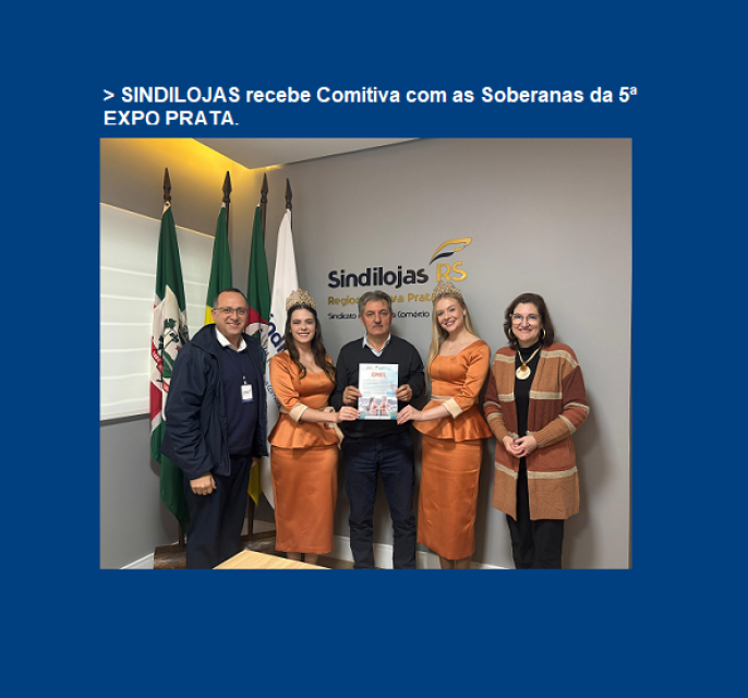 Em uma conversa com o Presidente do SINDILOJAS, Nelson Vazatta e colaboradores da entidade, as Soberanas entregaram o Convite Oficial da 5ª EXPO PRATA – 4ª Agro Feira Sicredi, que acontecerá este ano de 06 à 09 de novembro, no Complexo Afuvi e CTG Querência do Prata, em Nova Prata. O convite é estendido à Diretoria, Colaboradores, Associados e Representados pela entidade.