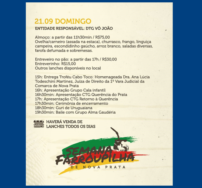 12/09 - Semana Farroupilha de Nova Prata, de 13 a 21 de setembro (programação completa) – Por Município de Nova Prata – Sindilojas Regional Nova Prata APOIA e CONVIDA.