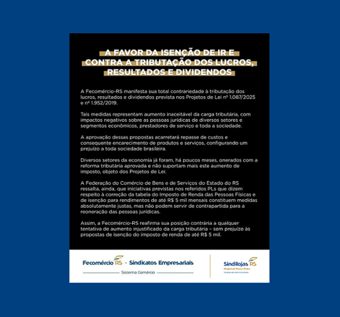 A Fecomércio-RS manifesta sua total contrariedade à tributação dos lucros, resultados e dividendos prevista nos Projetos de Lei Nº 1.087/2025 e Nº 1.952/2019.