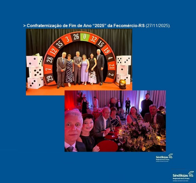 > Aconteceu na noite de 27/11 (quinta-feira), na sede da Fecomércio-RS, em porto Alegre, o Jantar de Confraternização de Fim de Ano “2025”, da entidade. Estiveram presentes representando pelo Sindilojas Regional Nova Prata, o Presidente Nelson Vazatta, o Vice-Presidente Josemar Vendramin e o Diretor Jair Luiz Guadagnin, os mesmos são da Diretoria do SINDILOJAS e da Fecomércio-RS (todos participaram com suas esposas).