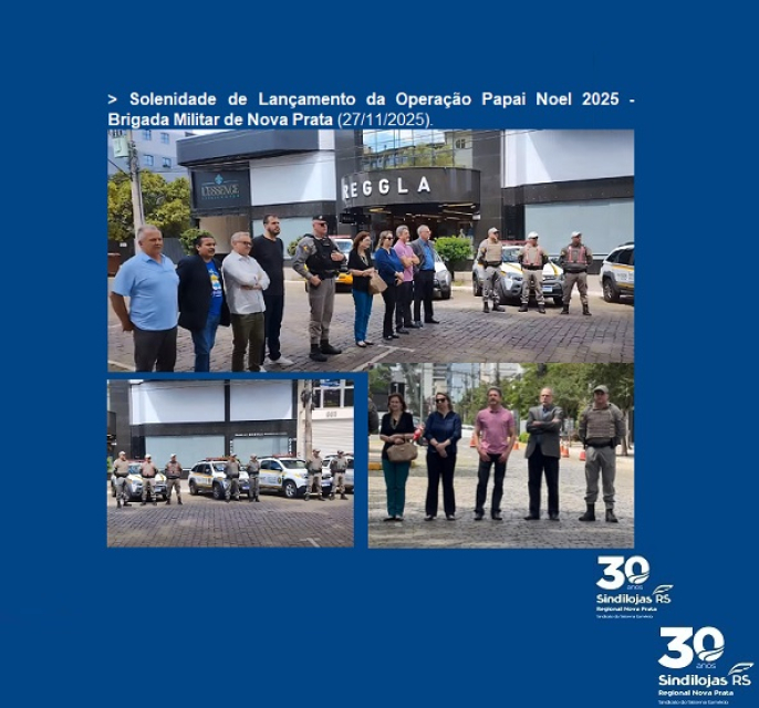 > Na manhã de 27/11 (quinta-feira), aconteceu na Praça da Bandeira de Nova Prata, o “Lançamento da Operação Papai Noel 2025” - Brigada Militar de Nova Prata. O Sindilojas Regional Nova Prata, convidado, se fez presente com o Diretor de Finanças e Patrimônio Pascoal Azambuja Bavaresco.
