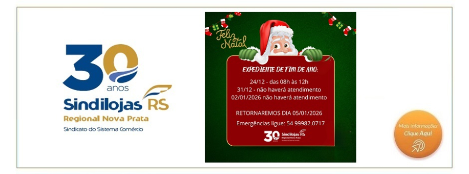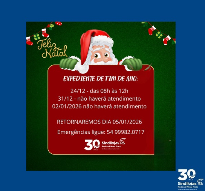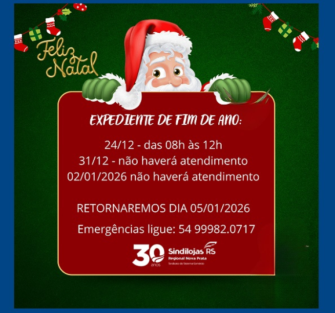 Expediente para as Festas de Fim de Ano “2025” - Sindilojas Regional Nova Prata.