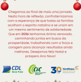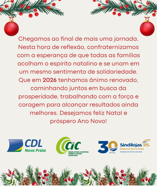 > O Sindilojas Regional Nova Prata, fez divulgação de Fim de Ano “2025”, no Jornal Correio Livre, em conjunto “CDL, CIC e SINDILOJAS”.