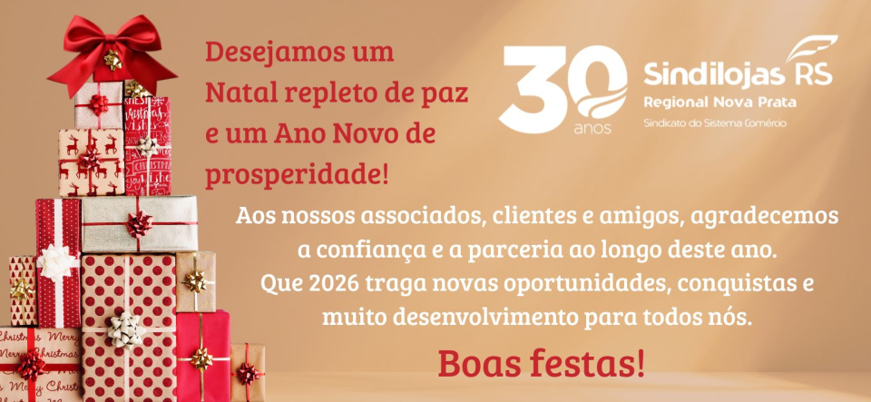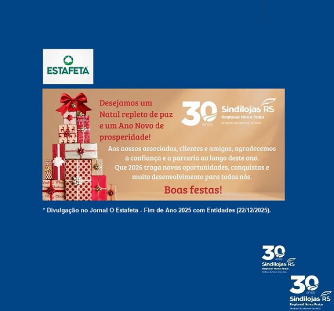 > O Sindilojas Regional Nova Prata, fez divulgação de Fim de Ano “2025”, no Jornal O Estafeta.