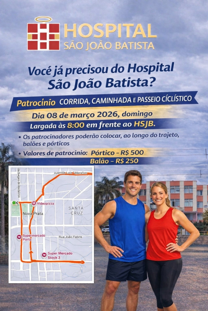 No dia 08 de março de 2026 (domingo) acontece a Corrida, Caminhada e Passeio Ciclístico do Hospital São João Batista, com largada às 8h, em frente ao HSJB.