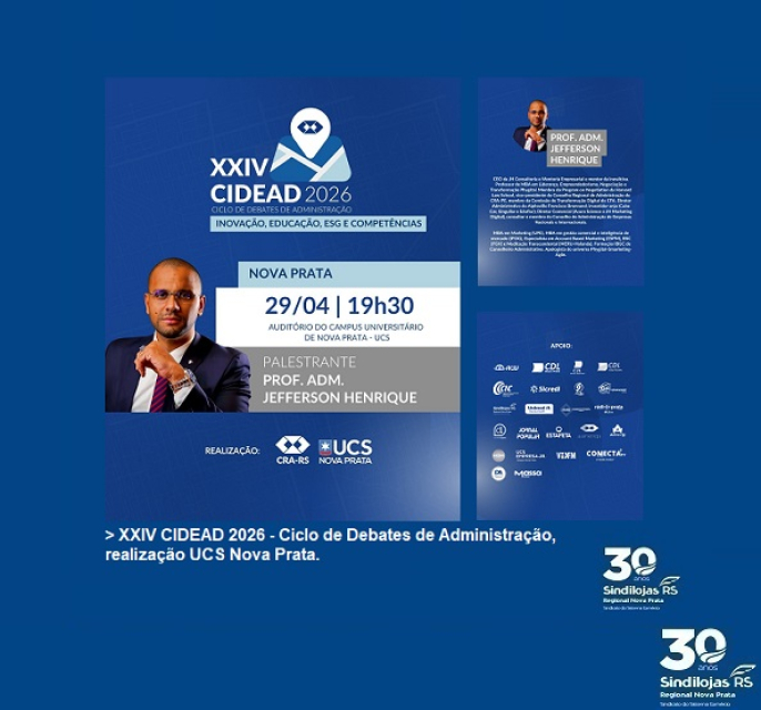 > O Sindilojas Regional Nova Prata, como em outros anos, está apoiando a realização XXIV CIDEAD 2026 - Ciclo de Debates de Administração, que tem o tema “Inovação, Educação, ESG e Competências”.