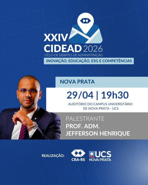 O CIDEAD 2026, acontece na quarta-feira (29/04), às 19h30min, no Auditório do Campus Universitário da UCS Nova Prata. A programação contará com a palestra do Prof. Adm. Jefferson Henrique, trazendo reflexões atuais e relevantes para o cenário da administração.