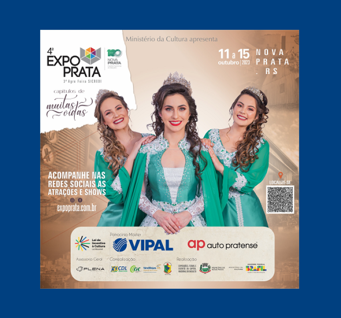 Unindo forças com o Município de Nova Prata, e as Entidades de Nova Prata “Exposições, Feiras e Eventos da Capital Nacional do Basalto, CDL, CIC e SINDILOJAS”, estaremos em festa de 11 à 15 de outubro de 2023.